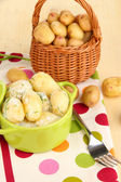 przetargu młodych ziemniaków z kwaśną śmietaną i zioła w patelni na drewniany stół szczegół