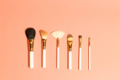 Kosmetyczne pędzle do makijażu w kobiecej dłoni na niebieskim tle.
