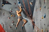 Potężny człowiek bez przedramienia szkolenia w Bouldering centrum