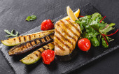Grillowane piersi indyka plasterkowane steki z pieczoną papryki, sałaty i pomidorów na czarnej planszy. Widok z góry, zbliżenie