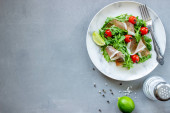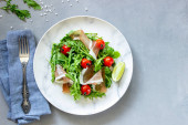 Sałatka z rukoli, pomidorów i prosciutto. Dania kuchni włoskiej. Zdrowe odżywianie. Diety.
