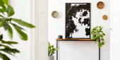 Zdjęcie "Zaprojektuj skandynawskie Wnętrze salonu z drewnianą konsolą, pierścienie na ścianie, wazony, klepsydra i eleganckie akcesoria osobiste. Stylowa Mapa plakat makiety. Nowoczesny wystrój wnętrz. Szablonu." może być wykorzystywane do celów osobistych i komercyjnych zgodnie z warunkami zakupionej licencji Royalty-free. Obraz jest dostępny do pobrania w jakości wysokiej rozdzielczości do 5760x3840.