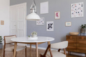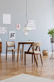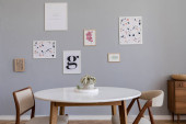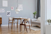 Zdjęcie "Stylowe skandynawskie Wnętrze salonu w ładnym mieszkaniu z szarą kanapą, raczył drewniane kome i kostki, rośliny i eleganckie akcesoria. Makiety ściany galerii plakaty. Nowoczesny wystrój wnętrz. " może być wykorzystywane do celów osobistych i komercyjnych zgodnie z warunkami zakupionej licencji Royalty-free. Obraz jest dostępny do pobrania w jakości wysokiej rozdzielczości do 5760x3840.