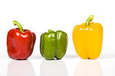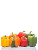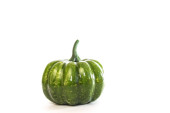 Trzy dekoracyjne sztuczne małe dynie na białym tle. Wielokolorowe warzywa pomarańczowo-żółto-zielony kolor do dekoracji wnętrz na jesienne wakacje, Halloluin