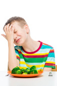 Smutne dziecko z talerzykiem brokułów przy stole, portret izolat