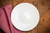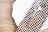 Srebrne sztućce na niebiesko-białej kwadratowej serwetce na białej płycie