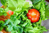 świeże warzywa i zieleni są w kosz na stare drewniane tła