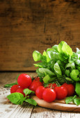 świeże warzywa i zieleni są w kosz na stare drewniane tła