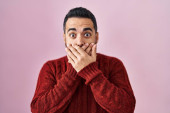 Indyjski biznesmen ubrany w białą elegancką koszulę stoi na białym tle żółtym wstrząśnięty obejmujące usta z rąk za pomyłkę. Sekretna koncepcja.