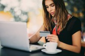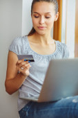 Młoda Blondynka trzyma karty kredytowej i za pomocą komputera przenośnego