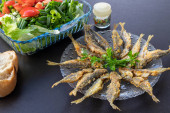 Zdjęcie "Świeżo smażone cefale z przyprawami, cytryną, ziemniakami, pomidorami, sałatką. Ryby i frytki. Czarne tło z kamienia. Wolne miejsce" może być wykorzystywane do celów osobistych i komercyjnych zgodnie z warunkami zakupionej licencji Royalty-free. Obraz jest dostępny do pobrania w jakości wysokiej rozdzielczości do 5760x3840.