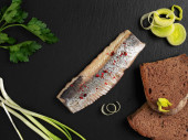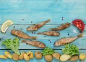 Świeżo smażone cefale z przyprawami, cytryną, ziemniakami, pomidorami, sałatką. Ryby i frytki. Czarne tło z kamienia. Wolne miejsce