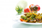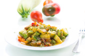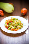 Smażona cukinia z czerwonej papryki, cebuli, pomidorów i innych warzyw