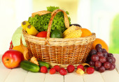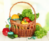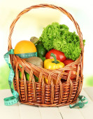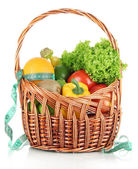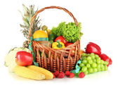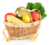 świeże warzywa w wiklinowym koszu na stole na jasnym tle
