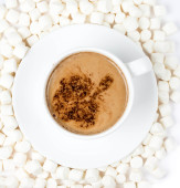 małą filiżankę kawy w szkle z uśmiech wzór na starym drewnianym stole.