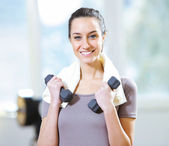 Szczęśliwa kobieta podnoszenia ciężarów w klubie zdrowia