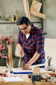 Uśmiechnięta kobieta stolarz w fartuch denim dając stos drewnianych desek do jej współpracownika