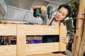 Poważny młody Wietnamski kobieta stolarz w goglach z tworzywa sztucznego wiercenia otworów pilotażowych w drewnianej desek na stole warsztatowym w Studio
