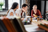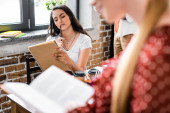 Selektywny fokus studenta trzyma papier kubek i tablet cyfrowy