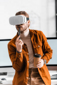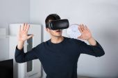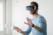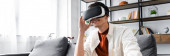 panoramiczny strzał człowieka z zestawu słuchawkowego wirtualnej rzeczywistości w mieszkaniu