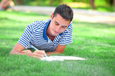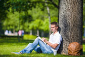 Teen chłopiec z książek i notebooków w parku.