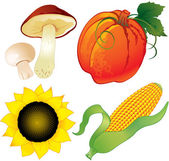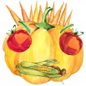 Akwarela malowane kolekcja warzyw pomarańczowych dyni, kukurydzy, marchwi i pszczół owadów. Ręcznie rysowane świeże wegańskie jedzenie na białym tle.