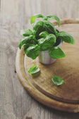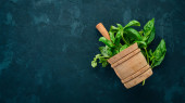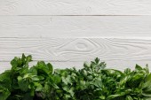 Widok z góry brązowy drewniany deska do krojenia z pietruszki, bazylii, kolendry i liści mięty mięty na białej powierzchni