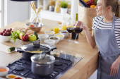Zdjęcie "Ładna kobieta pije wino w domu w kuchni." może być wykorzystywane do celów osobistych i komercyjnych zgodnie z warunkami zakupionej licencji Royalty-free. Obraz jest dostępny do pobrania w jakości wysokiej rozdzielczości do 5760x3840.