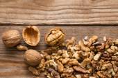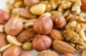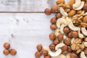 Różne nakrętki na białym drewnianym stole. Orzeszki ziemne, orzechy laskowe, orzechy włoskie, migdały.