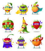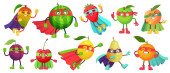 Superhero owoców i warzyw wzór wektora. Super banan, bakłażan z brokułami, cebulą, pieprzem w stroju bohatera. Ogród superbohaterów zdrowej żywności. Postacie bohaterów owoców i warzyw.