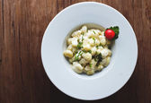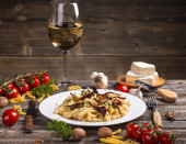 Makaron penne z sosem Carbonara w białej płytce na drewnianym białym tle