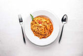 Makaron fettuccine z sosem pomidorowym, pietruszką i bazylią w białej płytce na rustykalnym drewnianym tle stołu