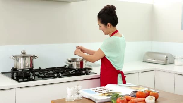 Młoda piękna Azjatycka kobieta z zielonym paskiem kucharzy na patelni na czarnym marmurowym stole także z jajkami, masłem, mielonym wieprzowiną. Gotowanie w nowoczesnej kuchni whith drzew tle.