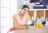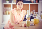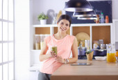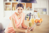 piękna młoda kobieta za pomocą tabletu cyfrowego w kuchni