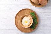Drewniana taca z dwiema ceramicznymi misami z zupą z kalafiora Dekoruj świeżą kalafior, tymianek i chleb. Jesień lub zima komfort żywności.