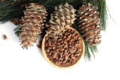 Stare szyszki cedrowe i orzechy na płytce świetlnych. Drewno cedrowe