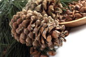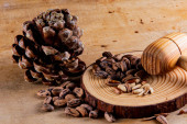 Zdjęcie "Stare szyszki cedrowe i orzechy na płytce świetlnych. Drewno cedrowe" może być wykorzystywane do celów osobistych i komercyjnych zgodnie z warunkami zakupionej licencji Royalty-free. Obraz jest dostępny do pobrania w jakości wysokiej rozdzielczości do 5760x3840.