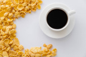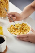 przycięte zdjęcie człowieka trzyma filiżankę kawy i łyżkę w misce z płatków kukurydzianych na białym tle marmuru