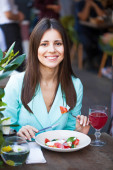 Piękna dziewczyna uśmiechnięta brunetka o obiad w kawiarni ulicy, s