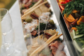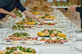 Stół z mieszaną żywnością. Bankiet w restauracji, ustawienie stołu. Differend posiłki dla Gości. Świeże jedzenie