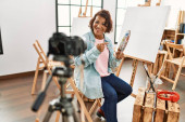 Female Asian blogger nagrywanie wideo w warsztacie