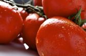 Czerwone pomidory wiśniowe z kropelek wody zbliżenie, makro.