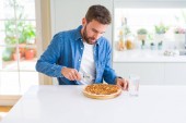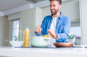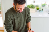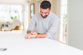 Zdjęcie "Przystojny Hiszpan ubrany w paski sweter w domu bardzo szczęśliwy i podekscytowany robi gest zwycięzcy z ramionami podniesione, uśmiechając się i krzyczeć na sukces. Koncepcja obchodów." może być wykorzystywane do celów osobistych i komercyjnych zgodnie z warunkami zakupionej licencji Royalty-free. Obraz jest dostępny do pobrania w jakości wysokiej rozdzielczości do 5760x3840.
