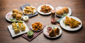 Różne indyjskie non wegetariańskie przepis żywności serwowane w grupie. Obejmuje Chicken Curry, Mutton Masala, Anda/jajko curry, kurczak masło, Biryani, Tandoori Murg, Kurczak-tikka i naan/Roti