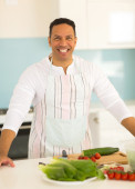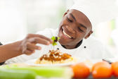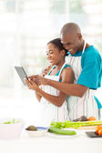 afrykańskiego człowieka w kuchni przy użyciu komputera typu tablet