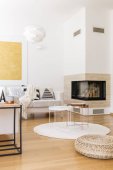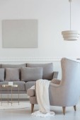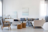 Eleganckie wnętrze salonu z sofą i stolikiem kawowym w jasnym mieszkaniu