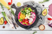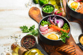 Zdjęcie "Wegańskie, detox przepis miski Buddy z ryżu, awokado, pomidory i ciecierzycy. Menu potraw. Wolna przestrzeń kopiowania. Widok z góry." może być wykorzystywane do celów osobistych i komercyjnych zgodnie z warunkami zakupionej licencji Royalty-free. Obraz jest dostępny do pobrania w jakości wysokiej rozdzielczości do 5760x3840.