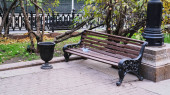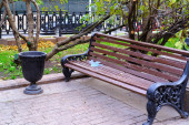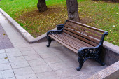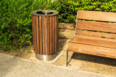 Zbliżenie pojemników na śmieci i ławek. Ława miejska wykonana z drewna na