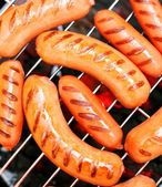 Kiełbasa z grilla na płonące grill. miejsce do grillowania. bearbeque na zewnątrz
