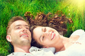 szczęśliwy uśmiechający się para relaksujący w parku. piknik